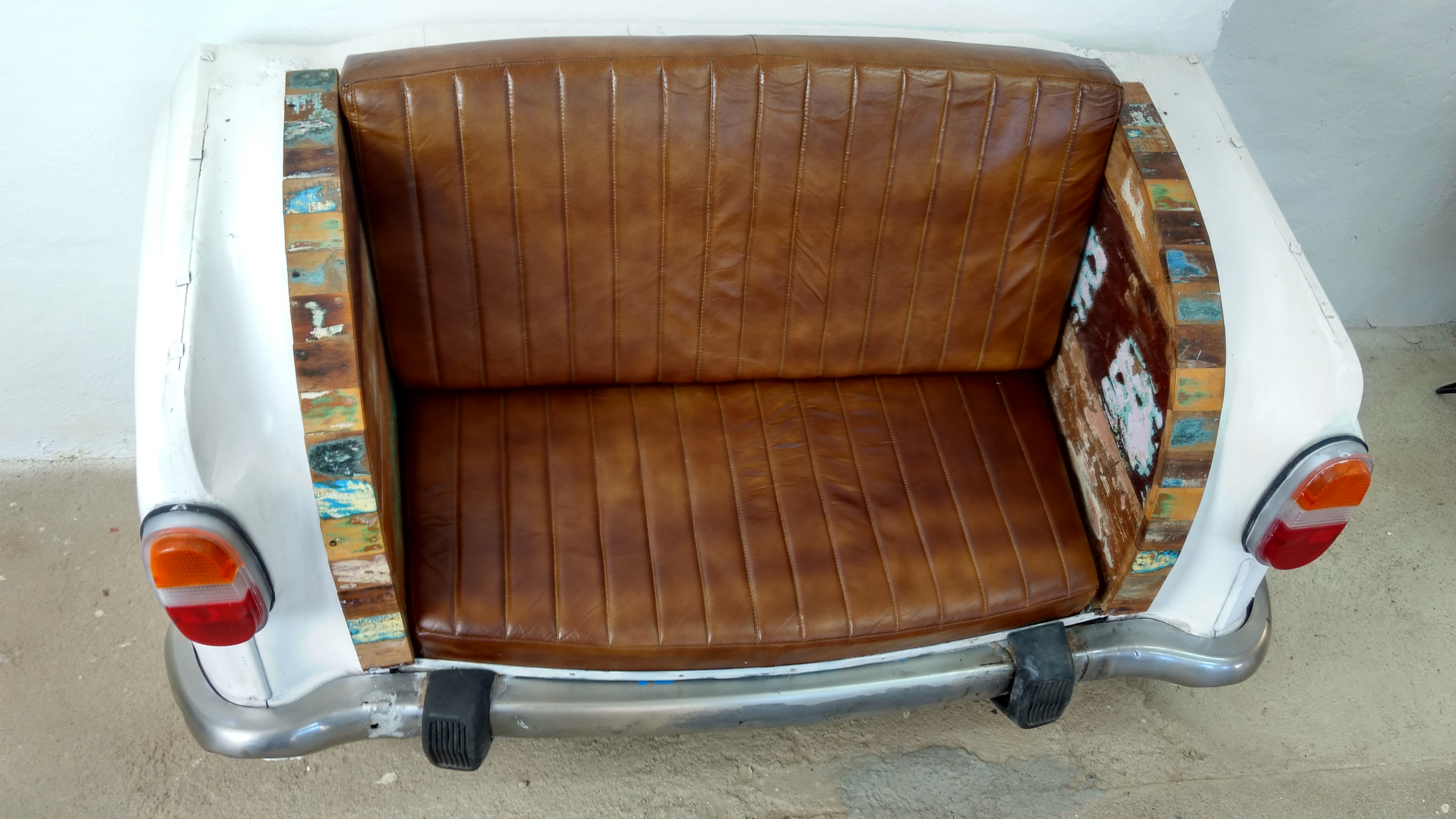 Hergestellt aus einem Auto Heck ist hier ein ganz Besonderes Sofa entstanden, was nicht nur alle Blicke auf sich ziehen wird, sondern gleichzeitig einen hohen Nutzungskomfort zu bieten hat. Das Heck vom Auto wurde optisch nicht verändert, sodass es ein Originalteil bleibt, welches aufgrund des Alters garantiert die eine oder andere Geschichte zu erzählen hat. Als Sitzpolster hat sich der Hersteller bei diesem Modell für echtes Leder entschieden. Dieses gilt als robust, pflegeleicht und bequem zugleich.