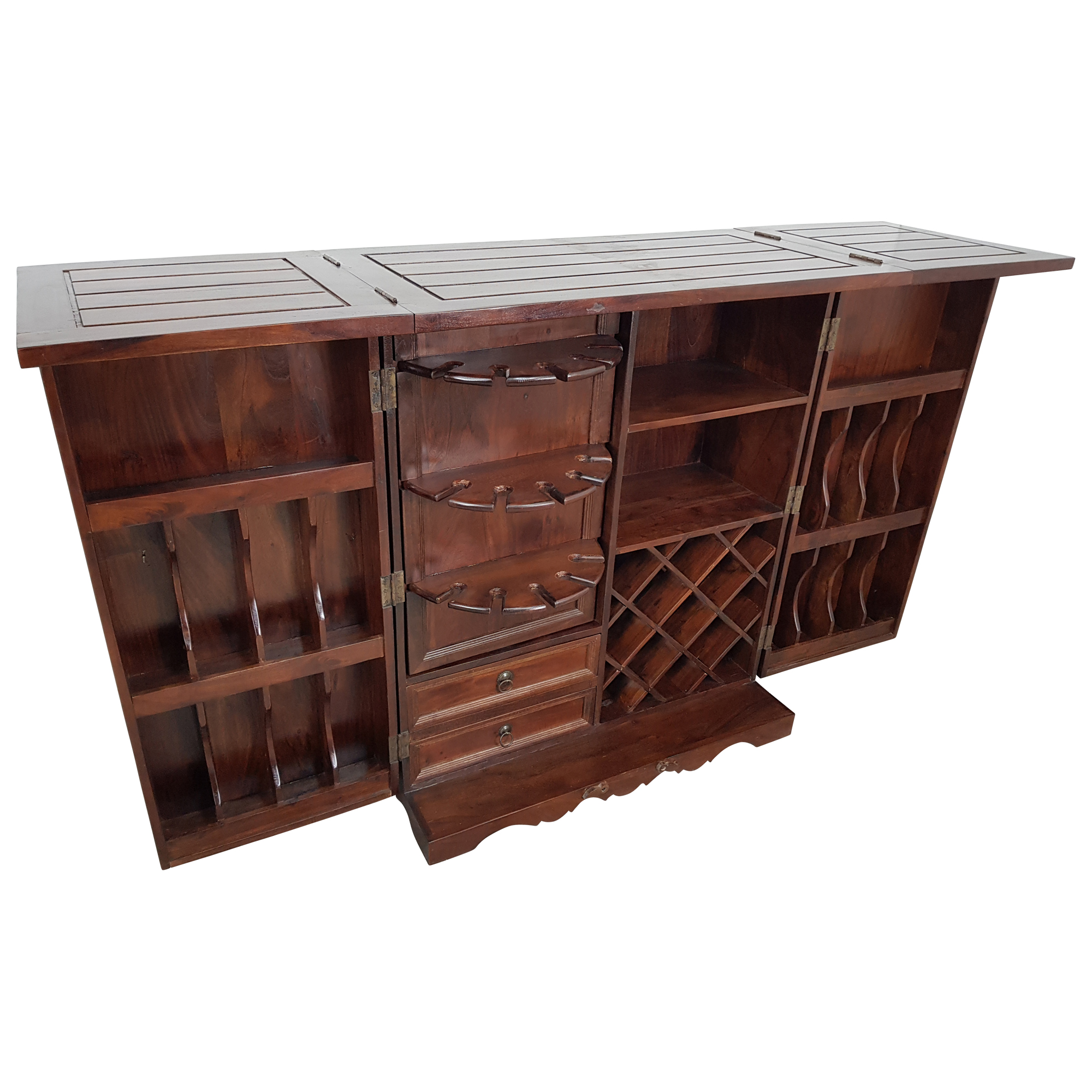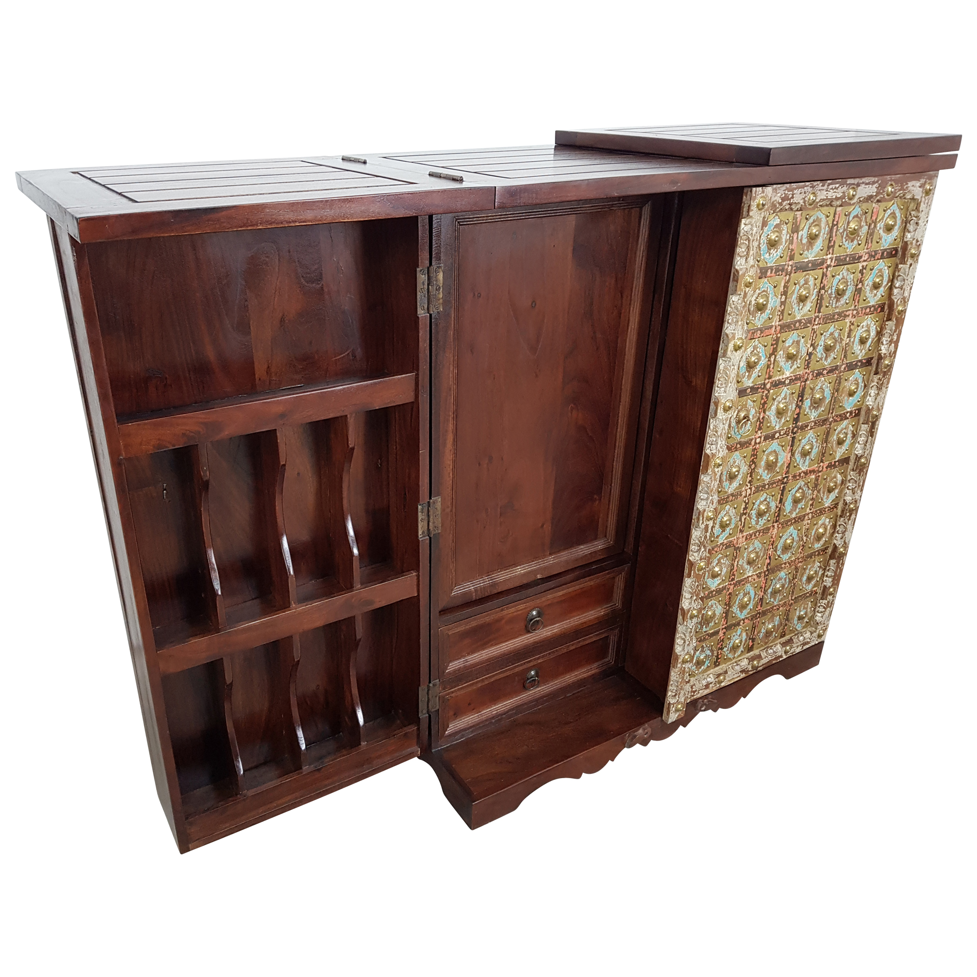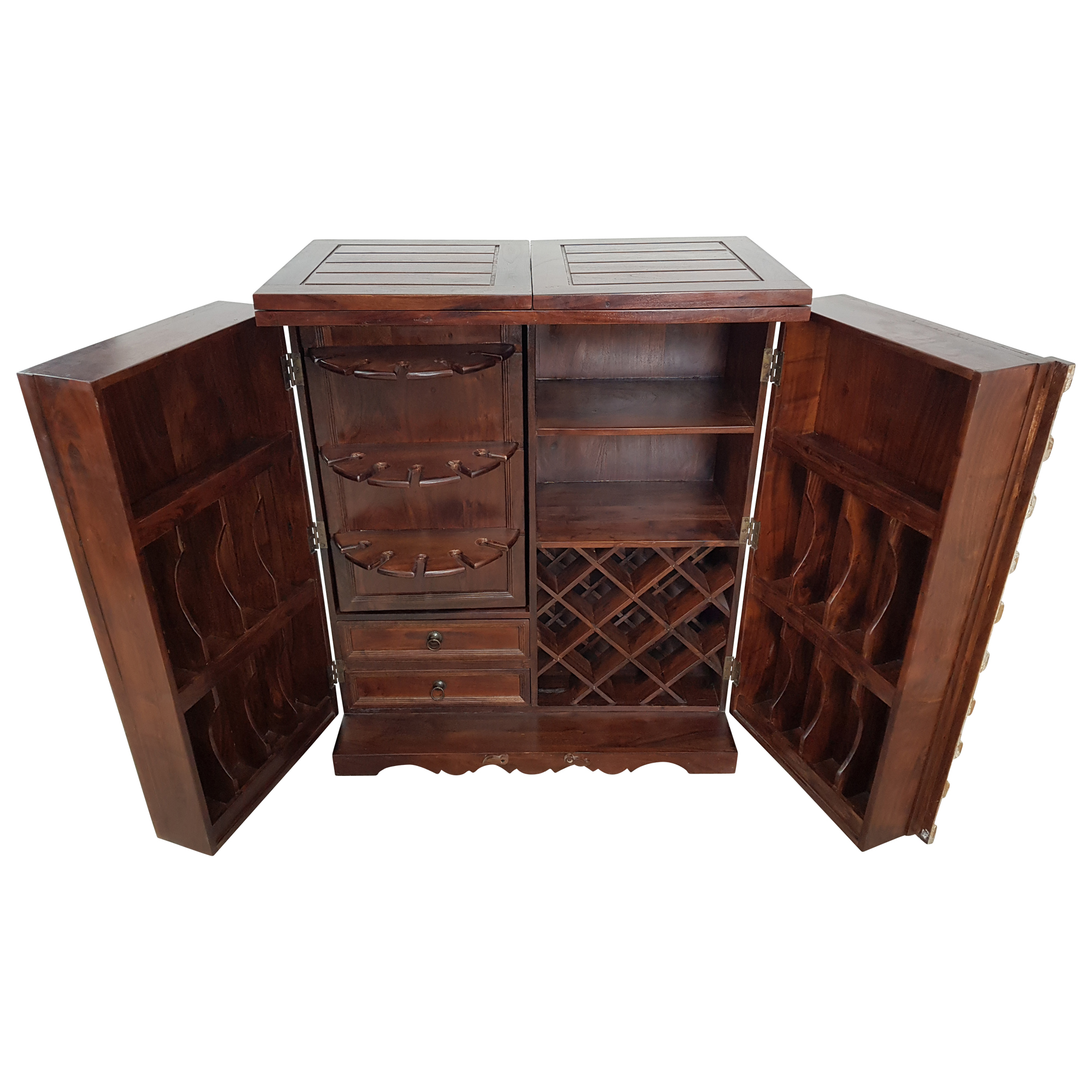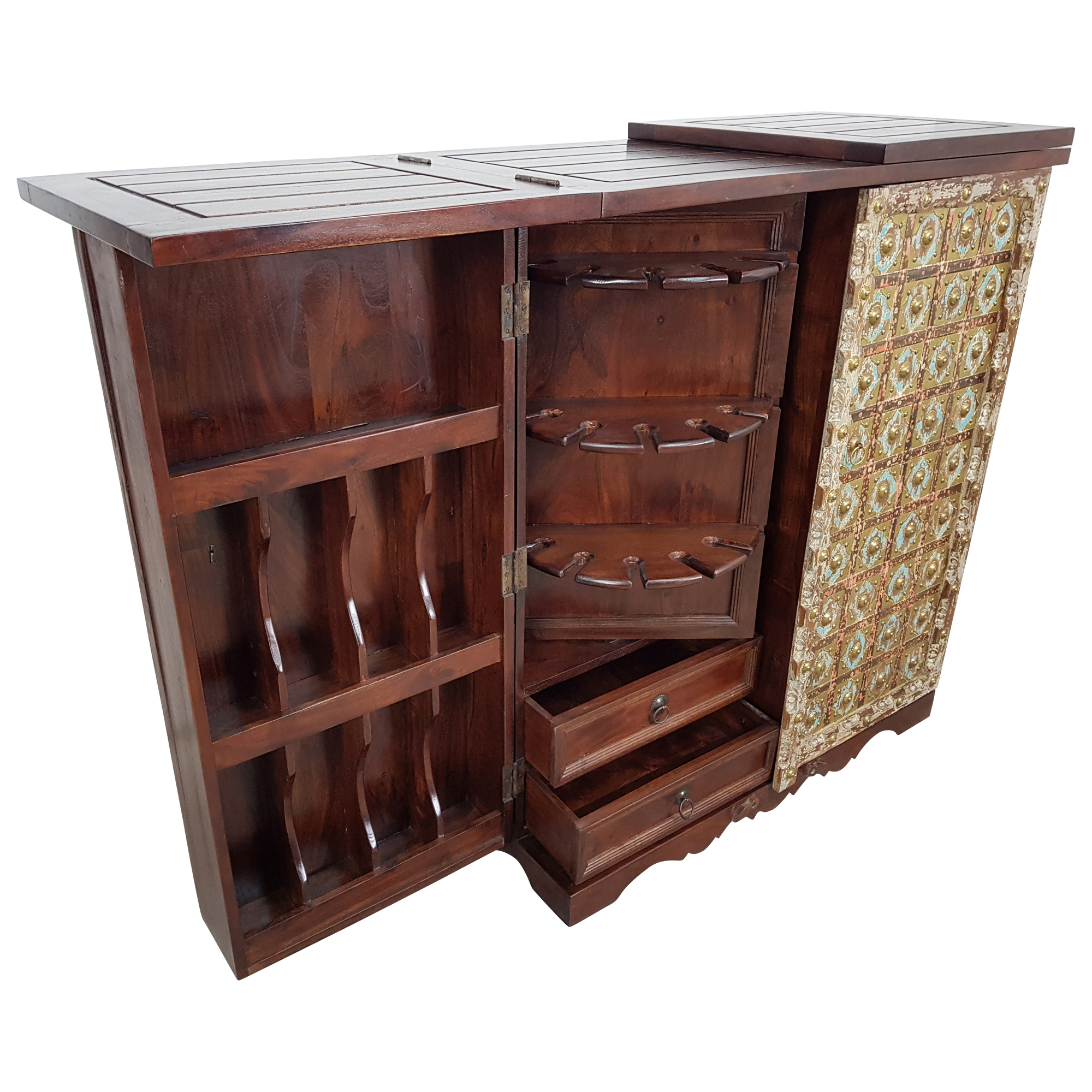 Bei diesem außergewöhnlichen Barschrank wurde nicht nur auf ein tolles Design und eine hervorragende Qualität, sondern ebenso auf praktische Maße und eine komfortable Innenaufteilung geachtet. Der Barschrank selbst wird per Handarbeit hergestellt und hat Maße von ca. (Breite / Tiefe / Höhe): 94 / 50 / 111 cm. Im Inneren warten mehrere Fächer in unterschiedlichen Größen, kleine Regale sowie auch eine Schublade darauf, in Zukunft befüllt zu werden.