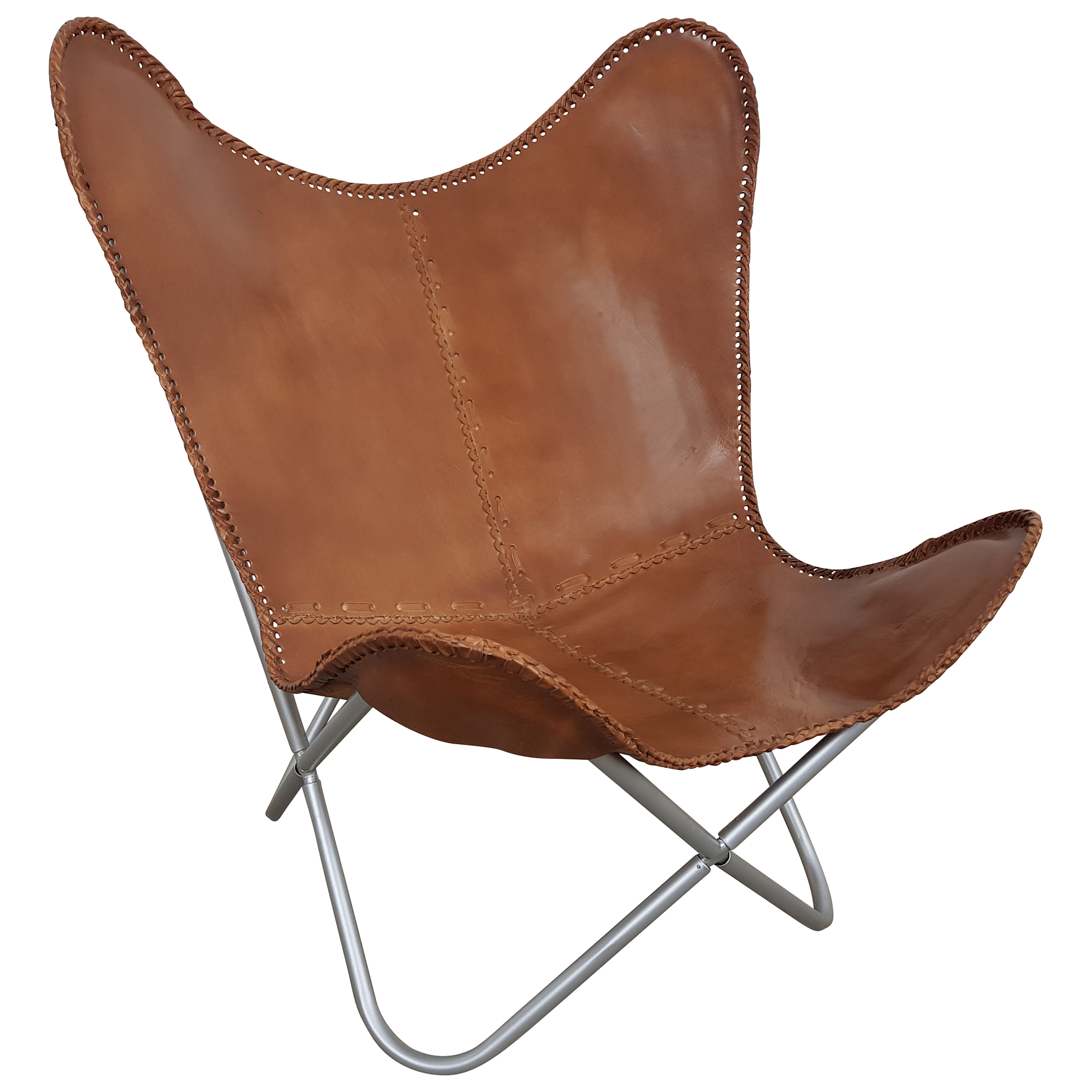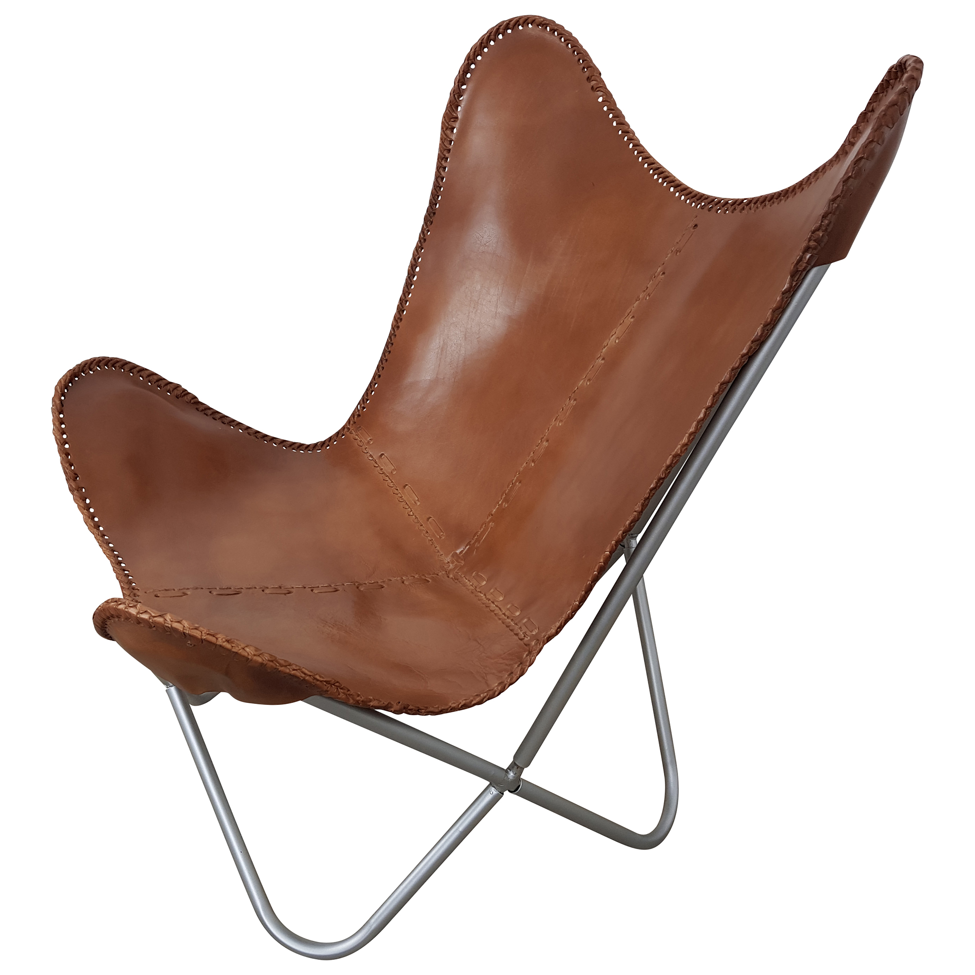 Der Butterfly Chair ist angelehnt an das Design des Originals und Klassikers von 1938. Er gilt dank seiner puristischen und zeitlosen Eleganz als eines der stilbildenden Sitzmöbel des 20. Jahrhunderts. Dieser Sessel-Typ galt bereits Ende der 1950er Jahre als Klassiker und wurde in die Sammlung des Museum of Modern Art in New York aufgenommen. Durch sein charakteristisches Design ist dieser Sessel in vielen Hollywoodfilmen zusehen und äußerst beliebt bei Architekten. Hergestellt aus geöltem Echtleder sowie einem silbernen Metallgestell passt sich dieser Stuhl perfekt den eigenen Bedürfnissen an. Mit Maßen von ca. (Breite / Tiefe / Höhe: 78 / 73 / 87 cm passt er sowohl in kleinere als auch größere Räumlichkeiten. Außerdem handelt es sich bei dem Butterfly Chair, wie auch bei den anderen Möbeln aus unserem Shop, um echte Handarbeit, sodass dieser bereits komplett fertig montiert und einsatzbereit geliefert wird.