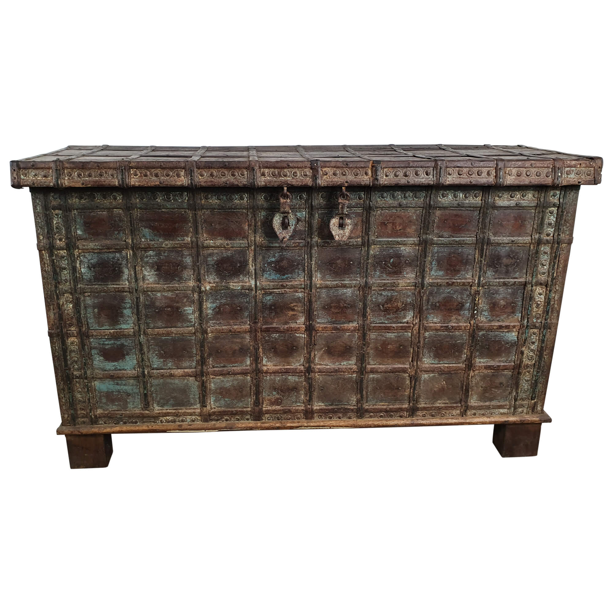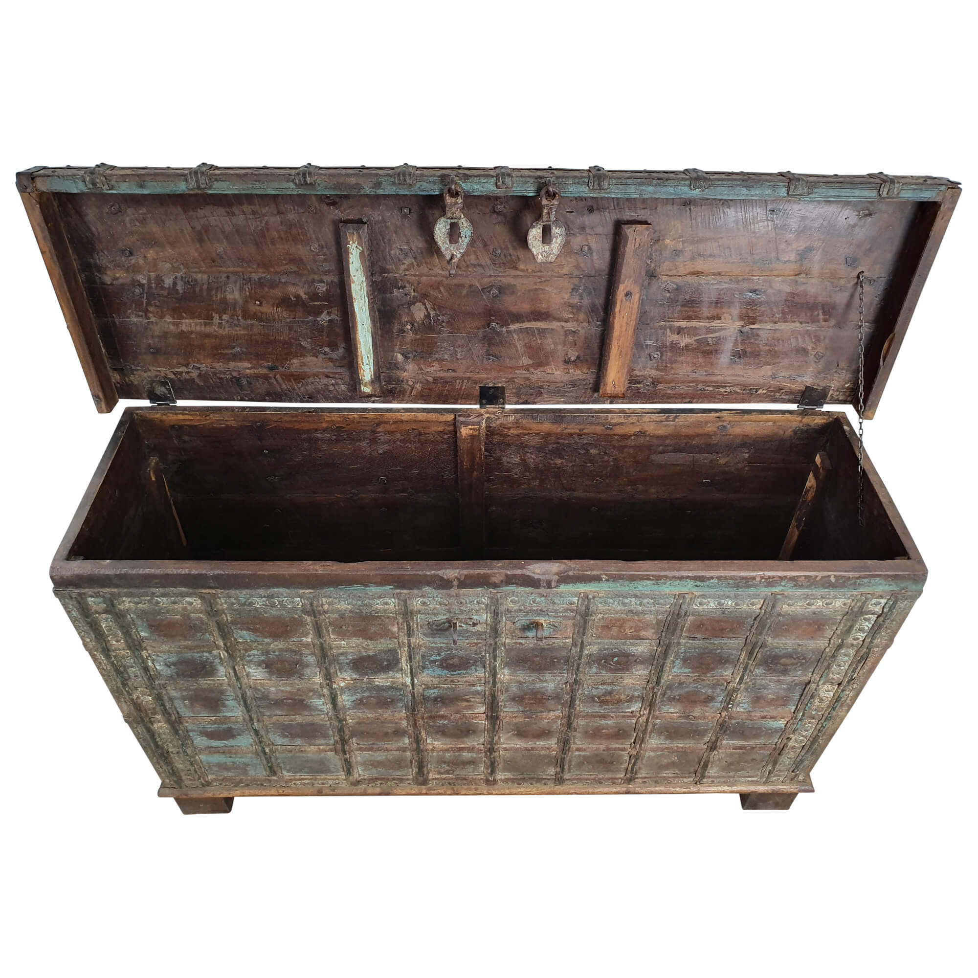Die antike Truhe mit zwei Verschlüssen hat Maße von ca. (Breite / Tiefe / Höhe ): 152 / 48 / 94 cm und kann bei Bedarf sogar verschlossen werden.