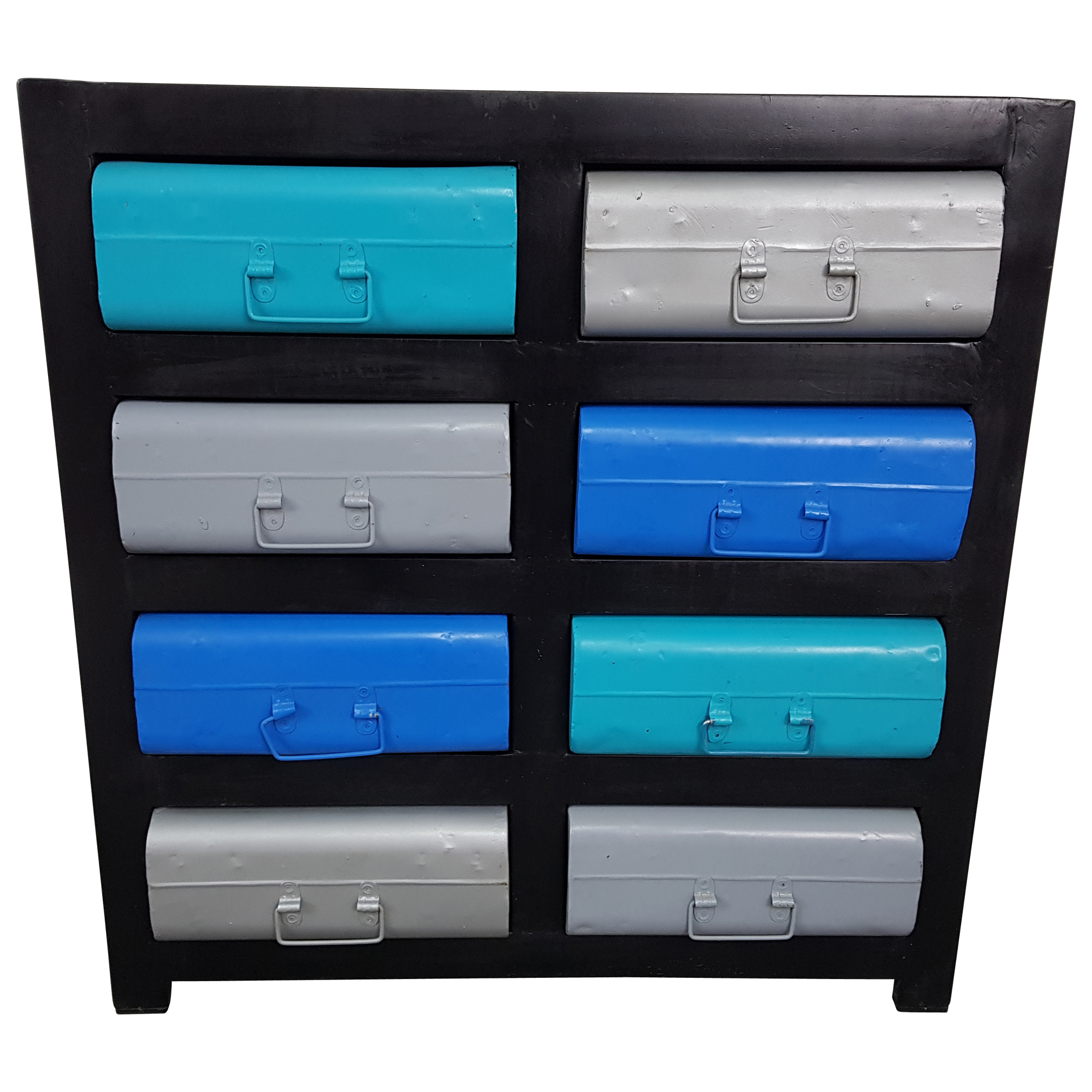 Unikat 7 Schöner Metall Kommoden Schrank mit 8 Schubladen im Koffer Design in Blau und grau gefertigt in Handarbeit