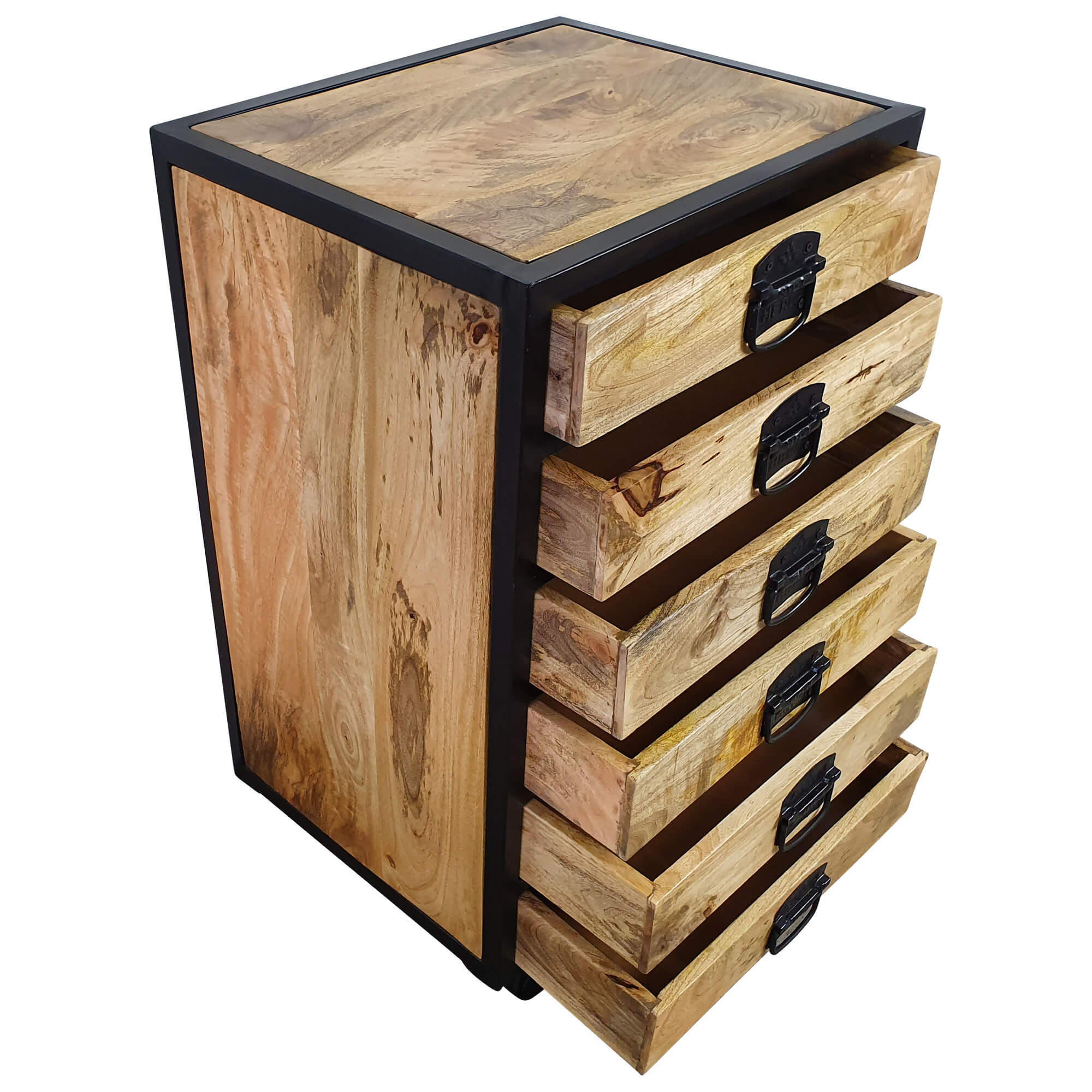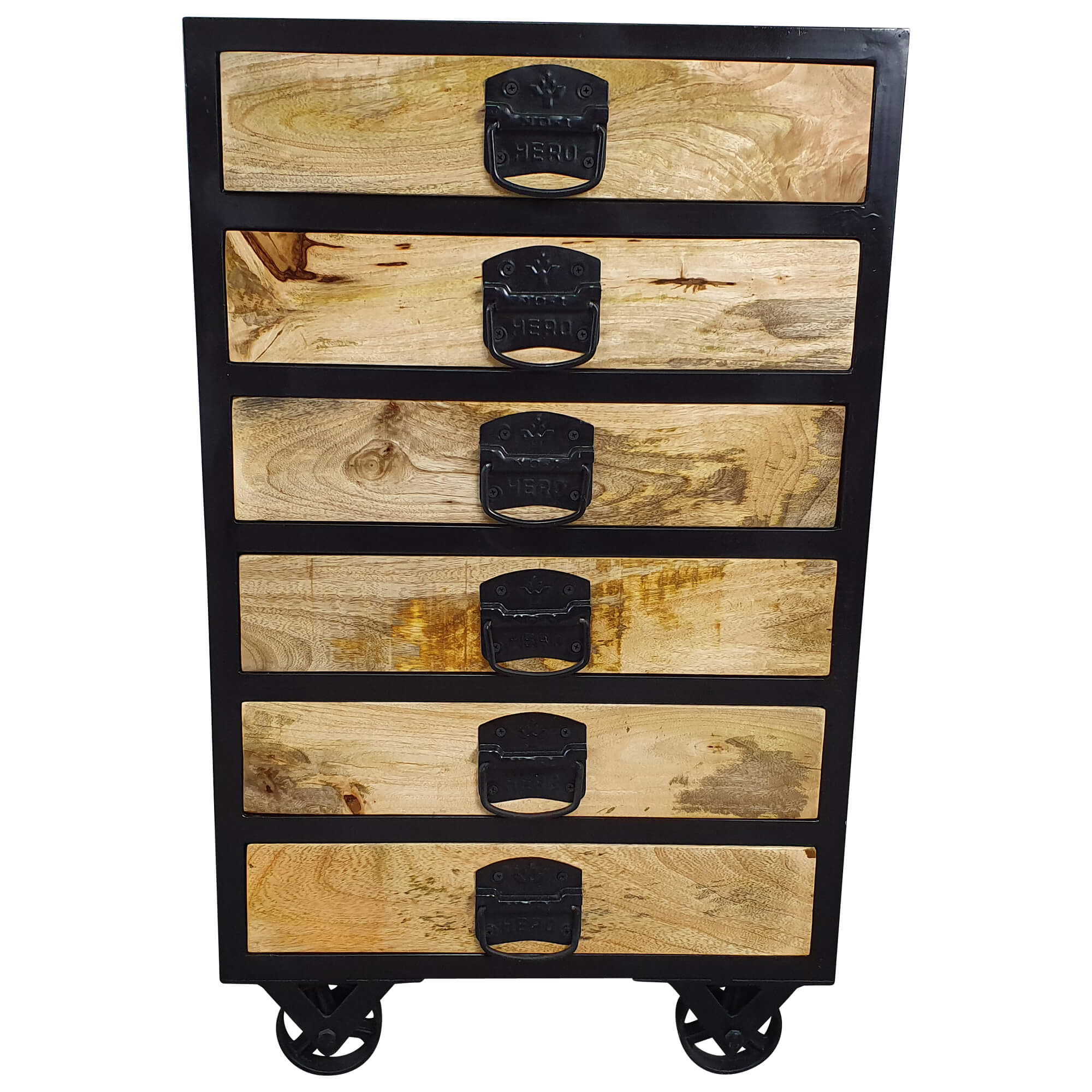 Jede Menge Stauraum und Nutzungskomfort verspricht dieser wunderschöne und hochwertige Schubladenschrank. Dieses Modell überzeugt allerdings nicht nur optisch auf ganzer Linie, er bietet mit sechs einzelnen Schubladen auch jede Menge Platz, um unterschiedliche Gegenstände sicher und griffbereit zu verstauen. Die Kombination aus Massivholz mit Metall lässt diesen Schubladenschrank in den unterschiedlichsten Räumlichkeiten zum echten Highlight werden. Des Weiteren passt sich die Massivholz Kommode perfekt der restlichen Einrichtung an, sodass es möglich ist, diese in nahezu allen Räumen einzusetzen. Mit den Rollen am Boden kann man die Kommode zusätzlich ideal verschieben.