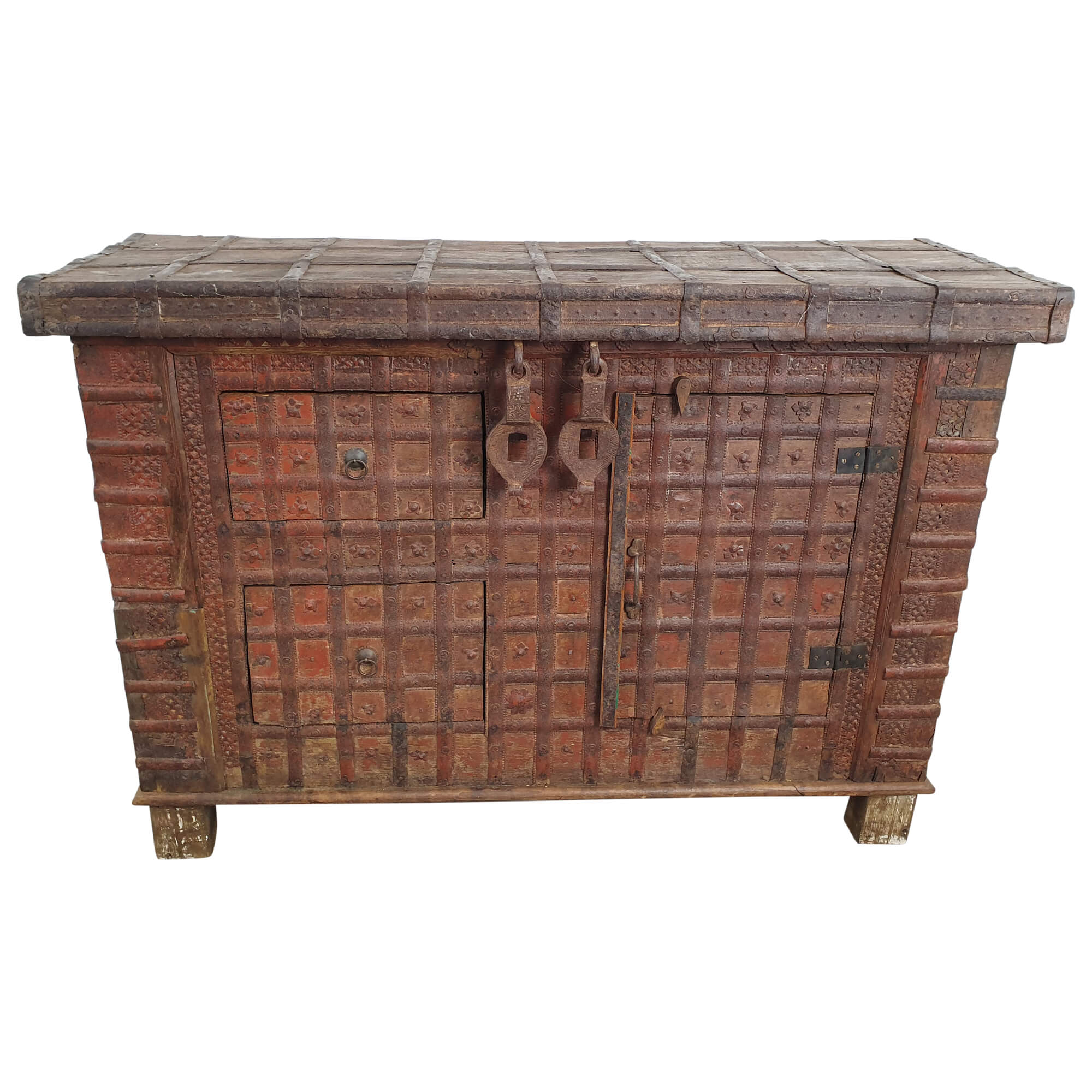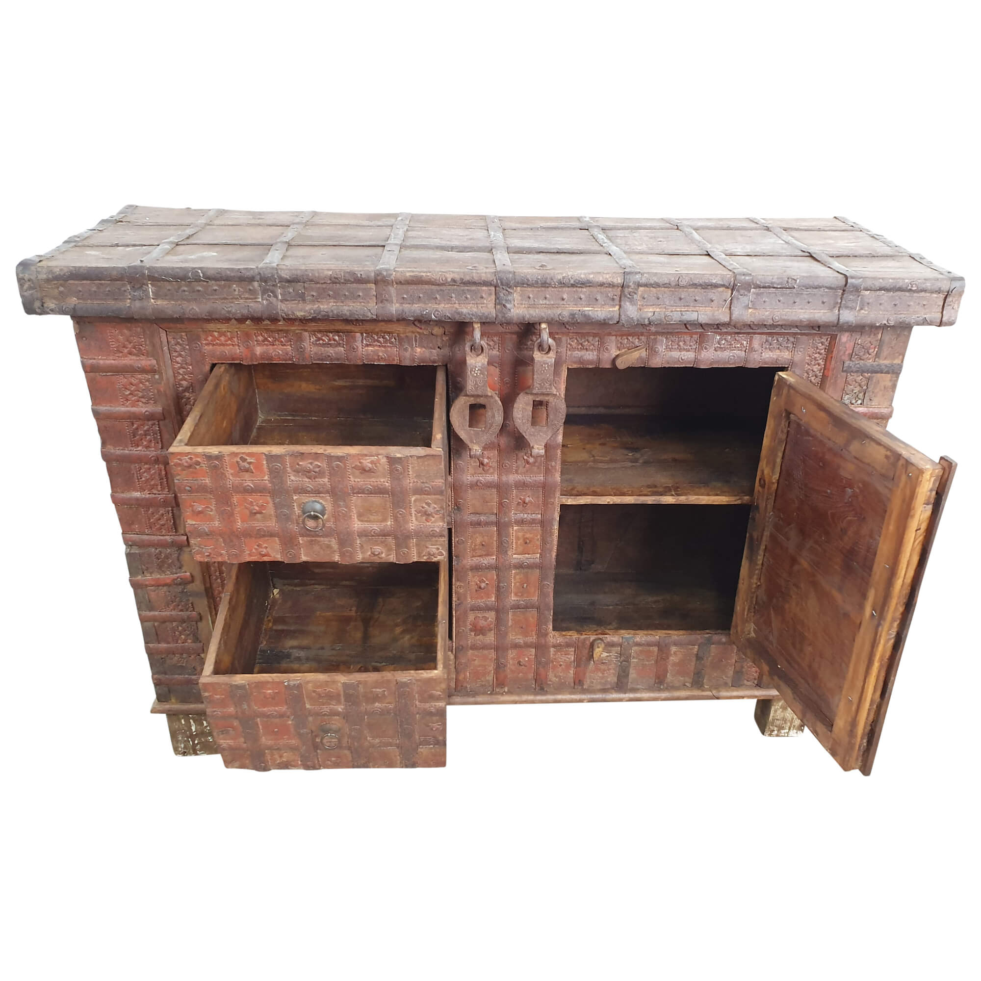 Dieses Möbelstück wirkt im ersten Augenblick wie eine ganz typische Altholztruhe, ist jedoch viel mehr als das. Während sich die typische Truhe von oben öffnen lässt, ist diese Kommode im Truhendesign mit zwei Schubladen sowie einer Tür samt kleinen Regalen im Inneren ausgestattet. Sie bietet also nicht nur Stauraum wie eine typische Truhe, sondern macht es zusätzlich möglich, hier Ordnung zu schaffen.