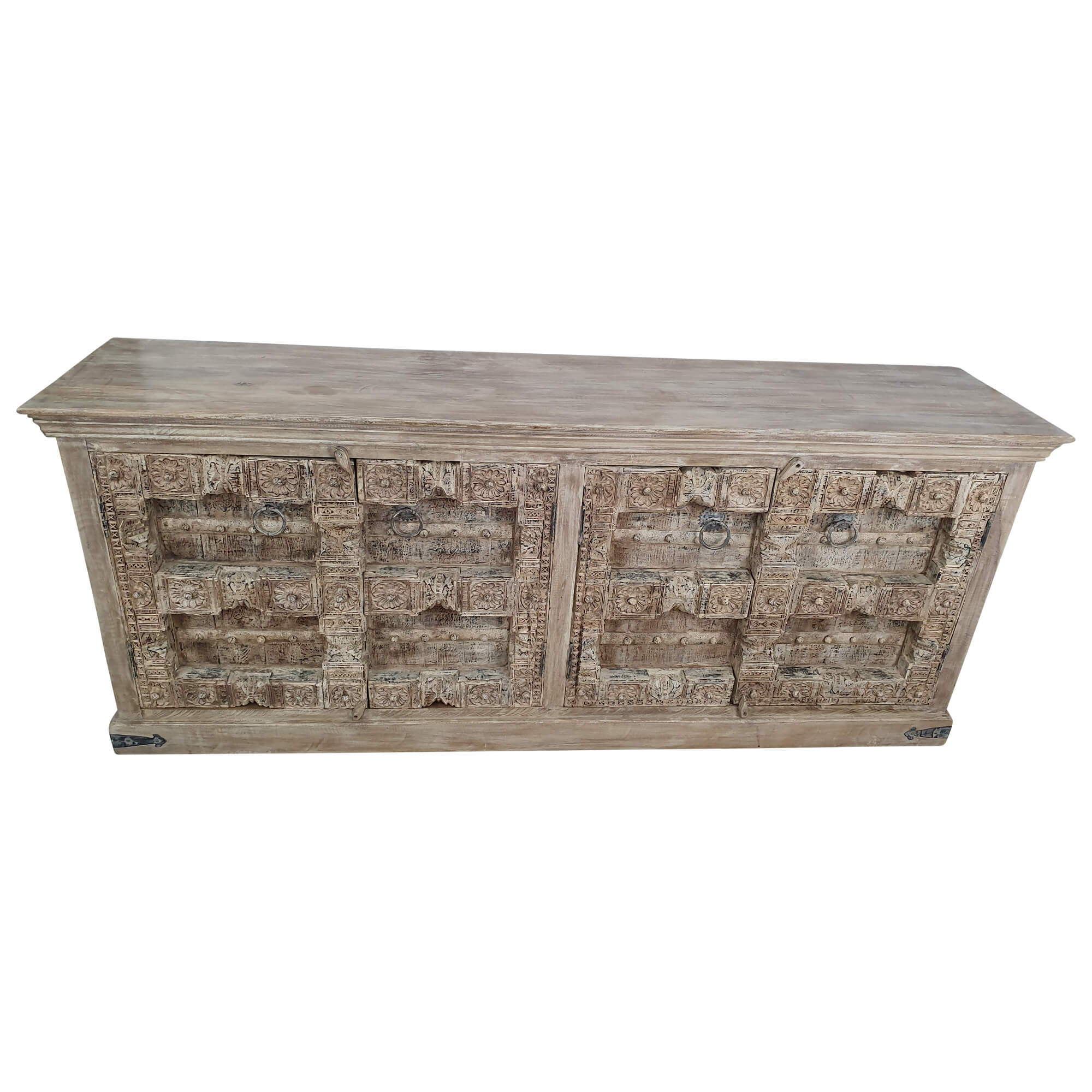 Viele Menschen achten bei dem Kauf eines Sideboards allerdings nicht nur auf das Design und die Qualität dieser Möbelstücke, sondern ebenso darauf, hier möglichst viel Platz zum Verstauen von Gegenständen zu bekommen. Im Inneren warten sowohl rechts als auch links hinter zwei Türen zwei Regale darauf, befüllt zu werden. Diese sind besonders stabil, sodass hier auch schweres Geschirr Platz und Sicherheit findet. Das Sideboard ist dabei ein echtes Unikat, welches es so nicht noch einmal gibt. Per Hand wurden einige Schnitzereien eingearbeitet und auch Metallelemente dürfen hier auf keinen Fall fehlen. Dieses Sideboard hat Maße von ca. (Breite / Tiefe / Höhe): 223 / 50 / 93 cm und wird bereits komplett fertig montiert geliefert, sodass es direkt einsatzbereit ist.
