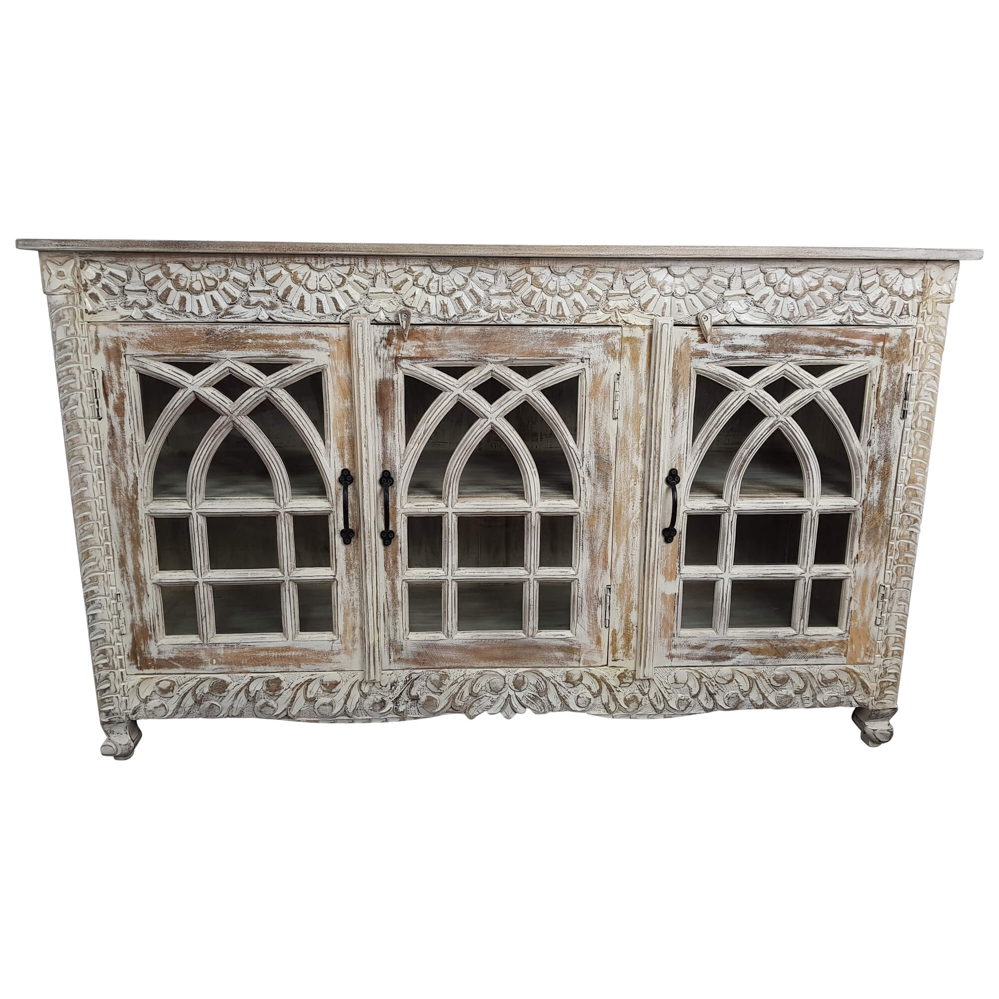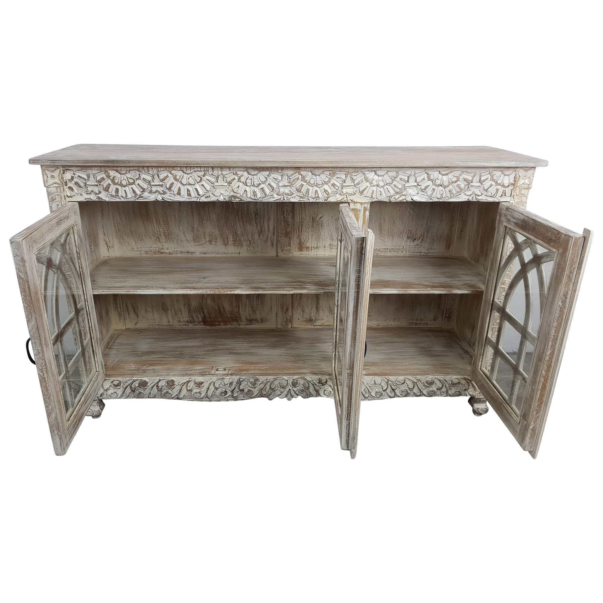 Dieses Sideboard macht jedoch nicht nur rein optisch einen tollen Eindruck. Mit Maßen von ca. 150 / 45 / 90 cm bietet sie im inneren ausreichend Platz, um hier unterschiedliche Gegenstände zu verstauen. Dabei bietet der Innenraum durch einen Einlegeboden zwei Ebenen. Die drei Türen sind zusätzlich mit Glas verziert, sodass das Innere stets von außen sichtbar ist. Die Kommode selbst eignet sich somit vor allem für schöne Gläser, Geschirr und andere Gegenstände, mit denen man auch dekorative Akzente setzen kann.