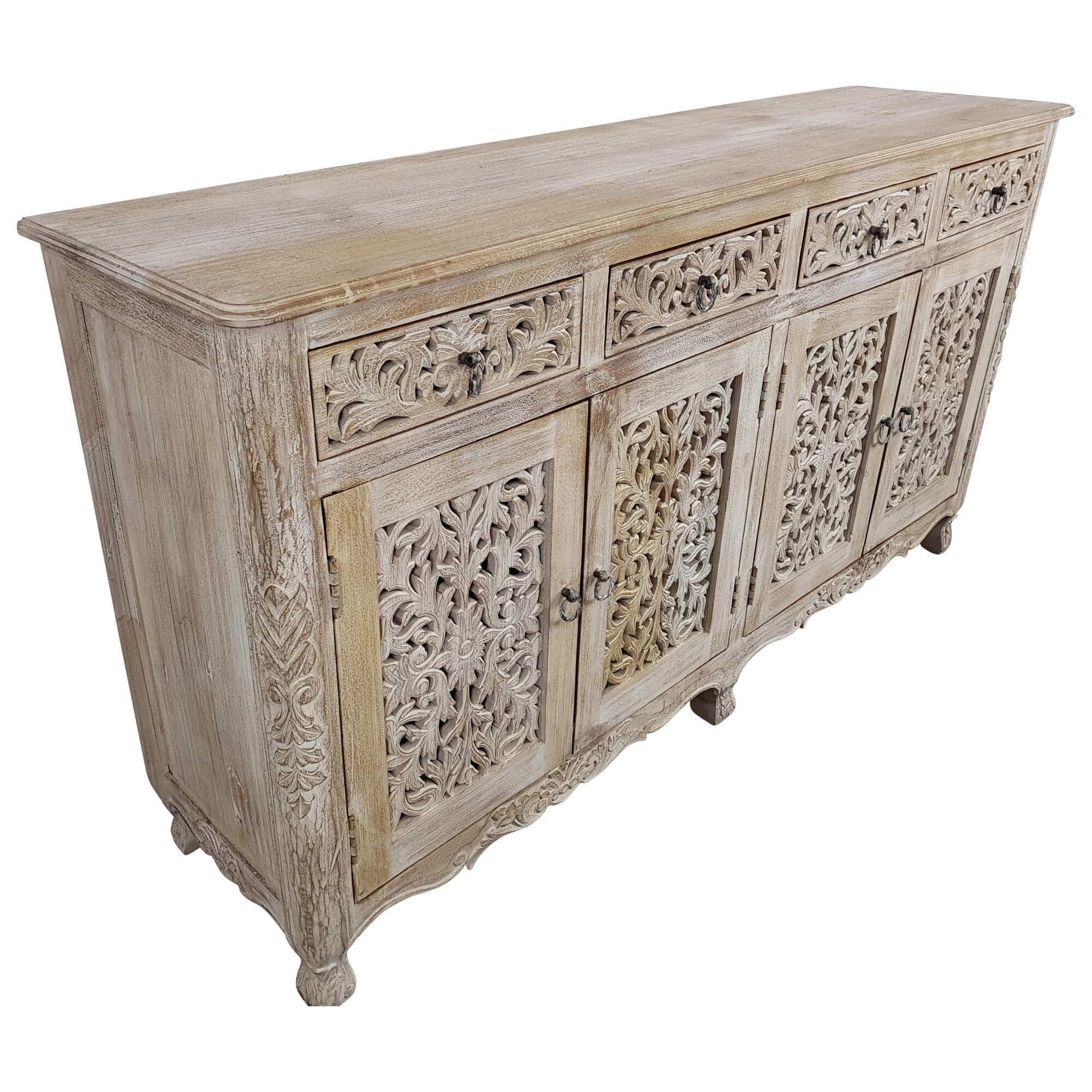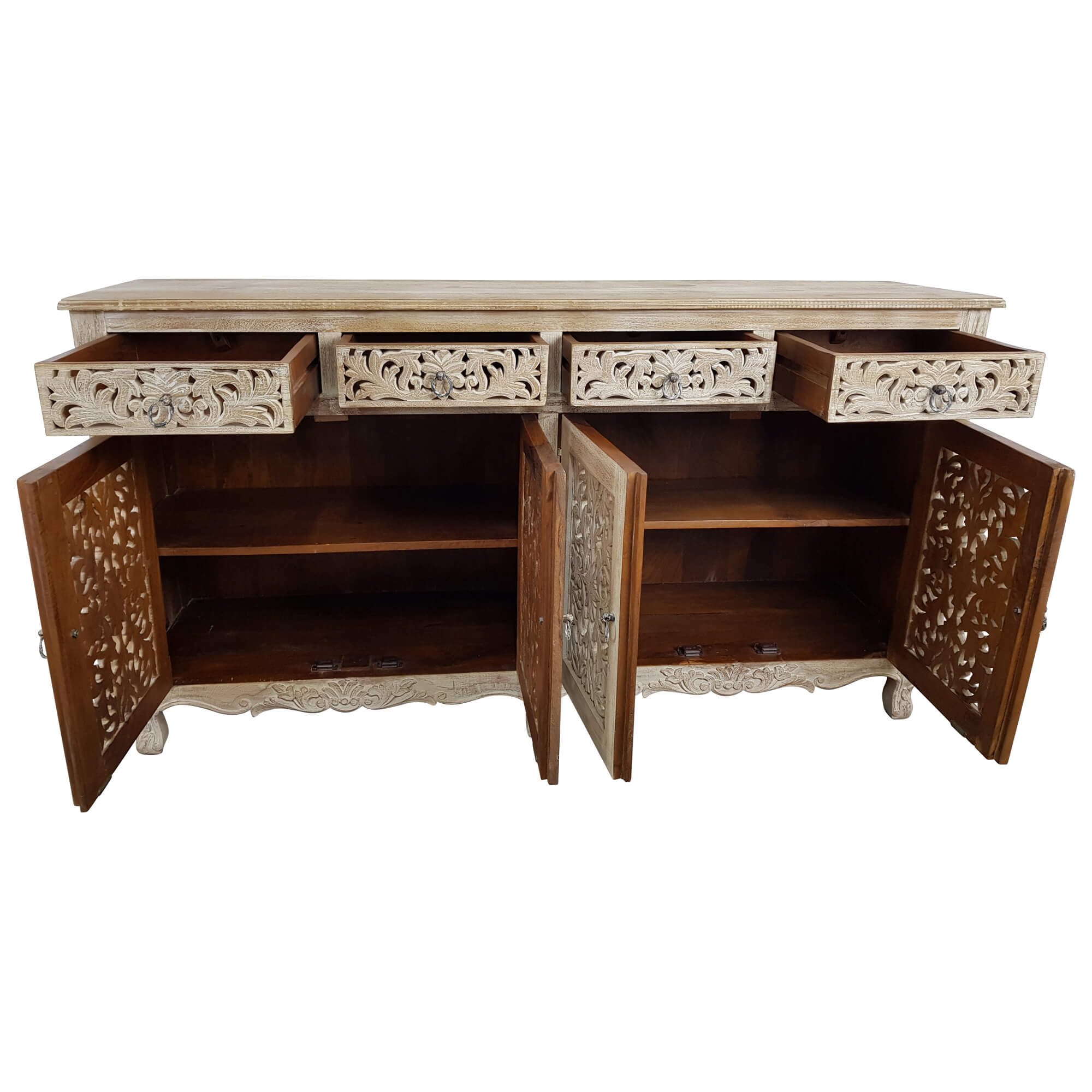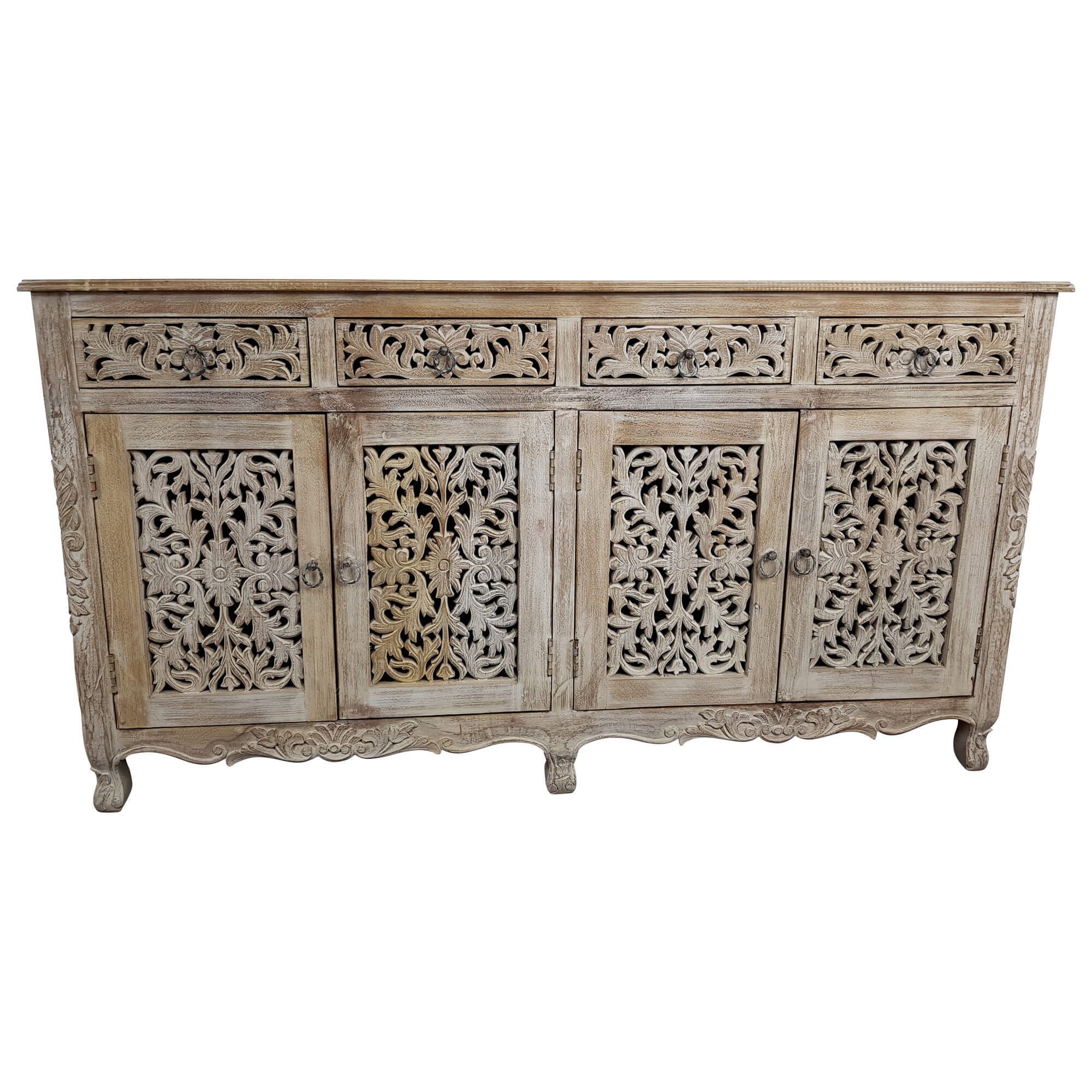 Diese wunderschöne Kommode ist genau das richtige für Menschen, die den Shabby Chíc Look lieben und kleine Details zu schätzen wissen. Hergestellt in sehr aufwendiger und liebevoller Handarbeit handelt es sich bei jeder dieser Kommoden aufgrund ihrer Schnitzereien und Details um echte Unikate, die es so auf keinen Fall ein zweites Mal zu kaufen gibt. Die weiße Hauptfarbe in Kombination mit dem immer wieder durchschimmernden Holzton der Mango macht den Used Look perfekt und ermöglicht es Nutzern, die Kommode bzw. das Sideboard auch mit anderen Möbelstilen zu kombinieren.
