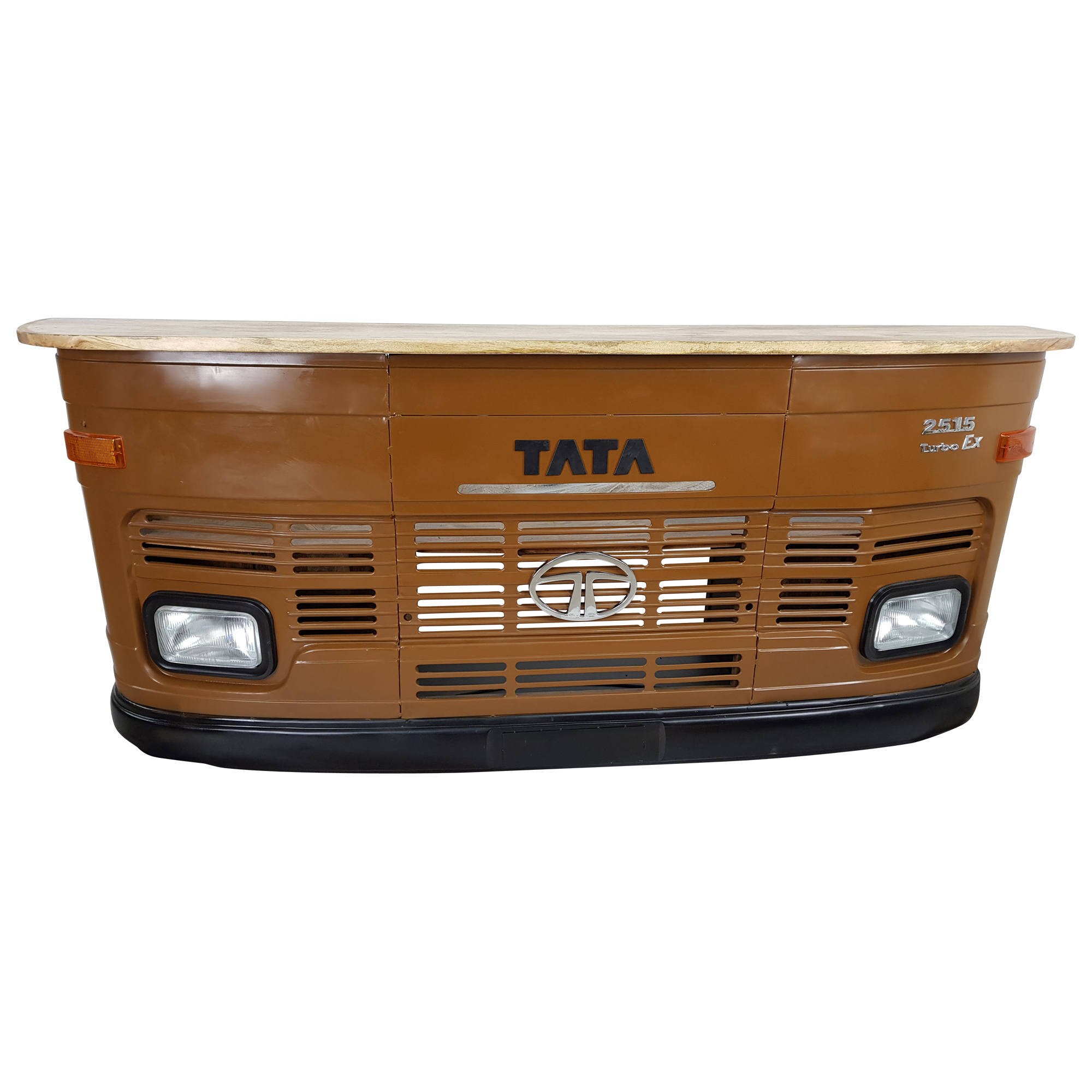 Dieser wunderschöne individuelle Tresen besticht durch seine einzigartige Industrielle Vintage Metall Optik in braun, seine Stauraum und Ablagemöglichkeiten machen ihn sehr funktionell und durch die beleuchtbaren Scheinwerfer zu einem Hingucker. Die Theke im Industrie Design gehört zu der Möbelserie Car Möbel und besticht durch seine schöne Massivholzplatte aus Mangoholz. Dieses Möbelstück ist aus einer Original altenTata LKW Front in Handarbeit gefertigt und lässt jeden Raum zum Highlight werden.