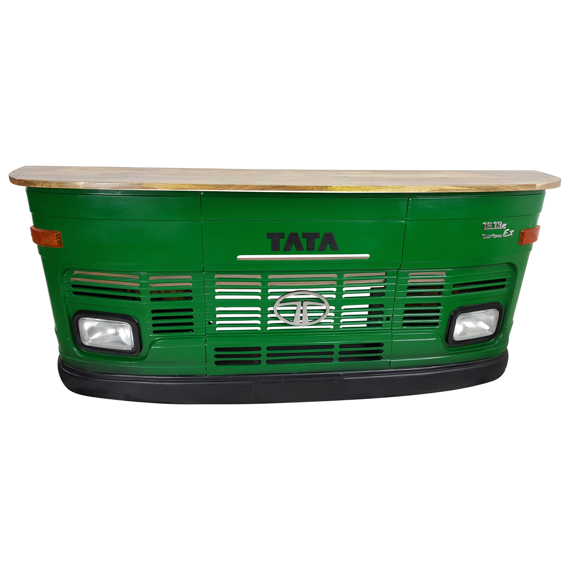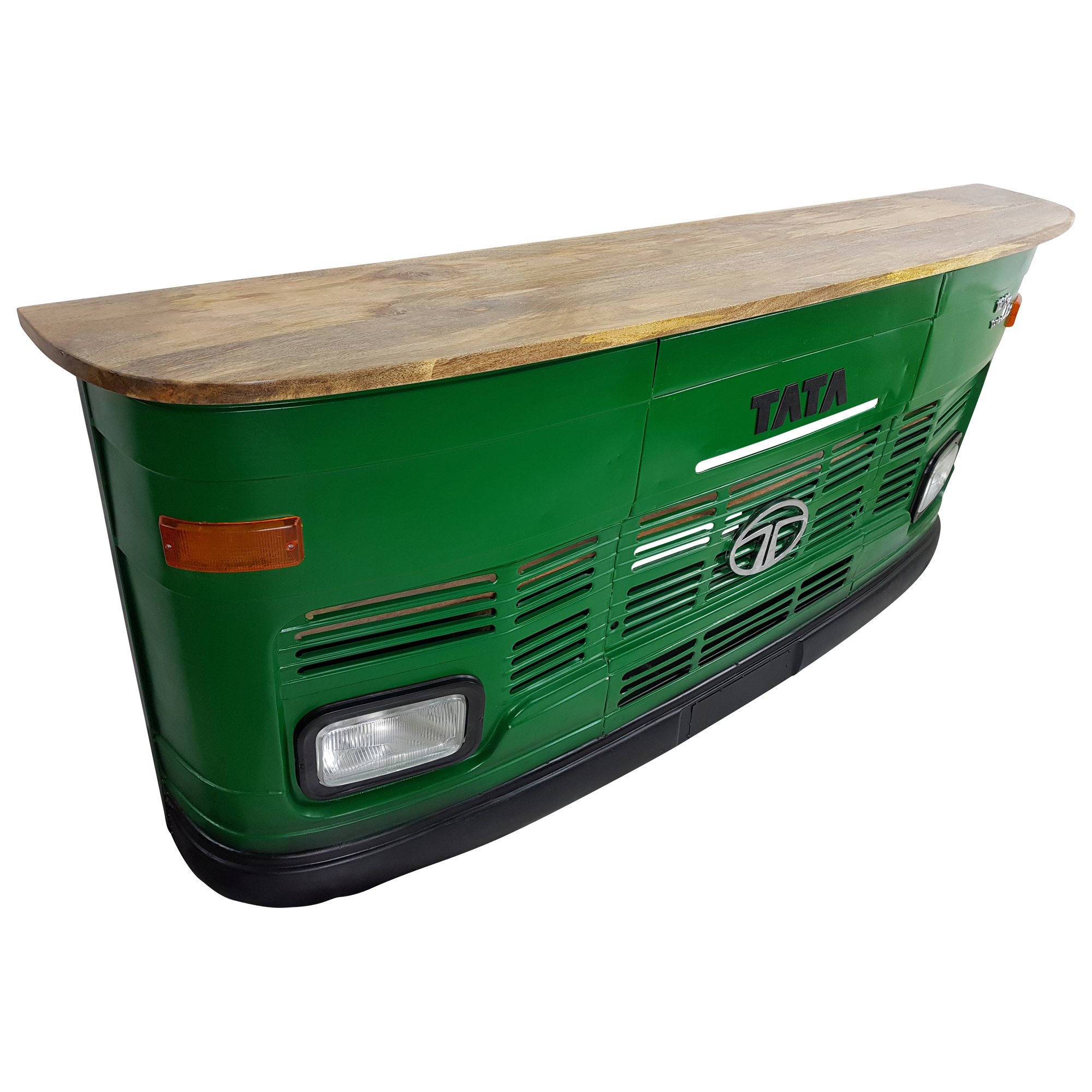 Dieser wunderschöne individuelle Tresen besticht durch seine einzigartige Industrielle Vintage Metall Optik in grün, seine Stauraum und Ablagemöglichkeiten machen ihn sehr funktionell und durch die beleuchtbaren Scheinwerfer zu einem Hingucker. Die Theke im Industrie Design gehört zu der Möbelserie Car Möbel und besticht durch seine schöne Massivholzplatte aus Mangoholz. Dieses Möbelstück ist aus einer Original alten Tata LKW Front in Handarbeit gefertigt und lässt jeden Raum zum Highlight werden.