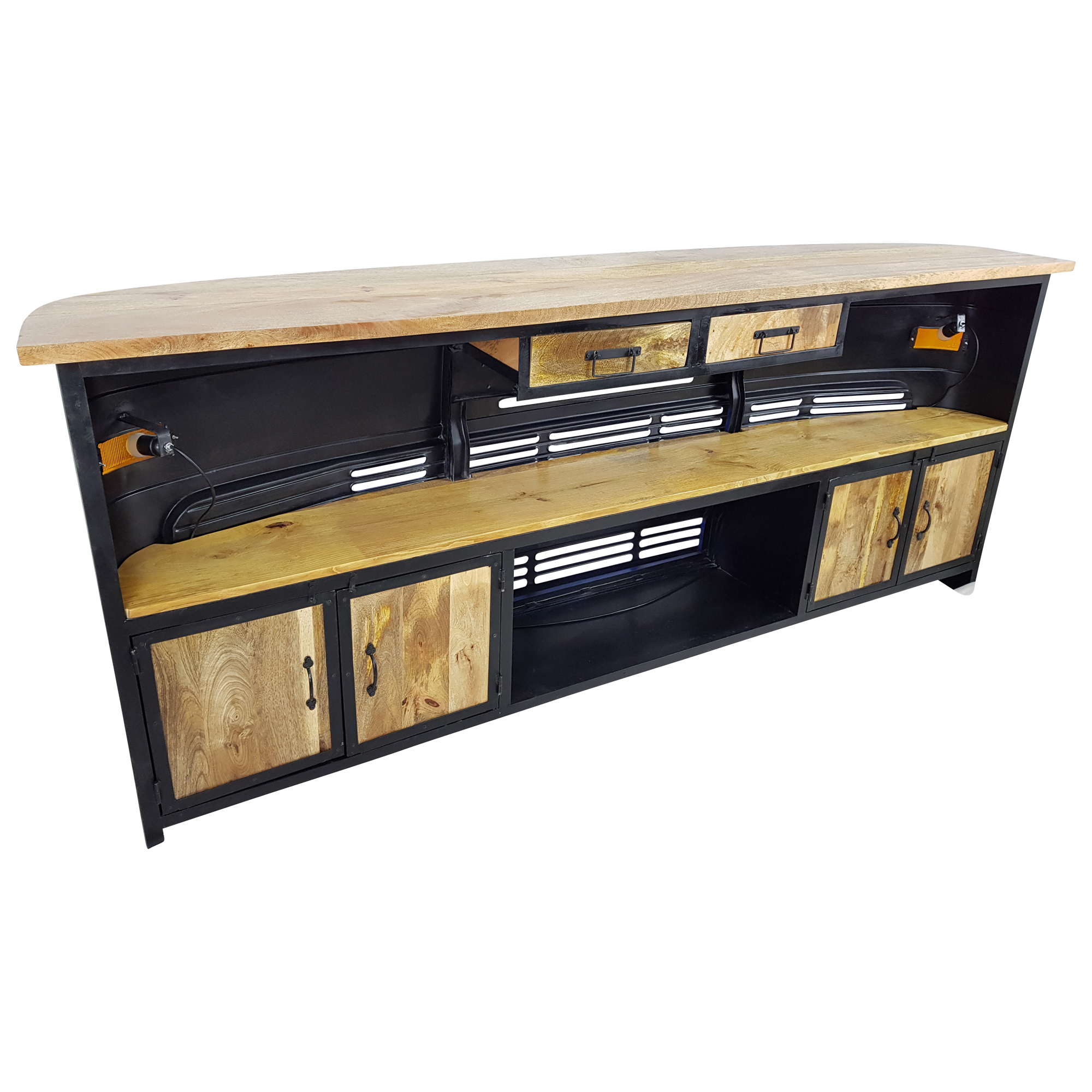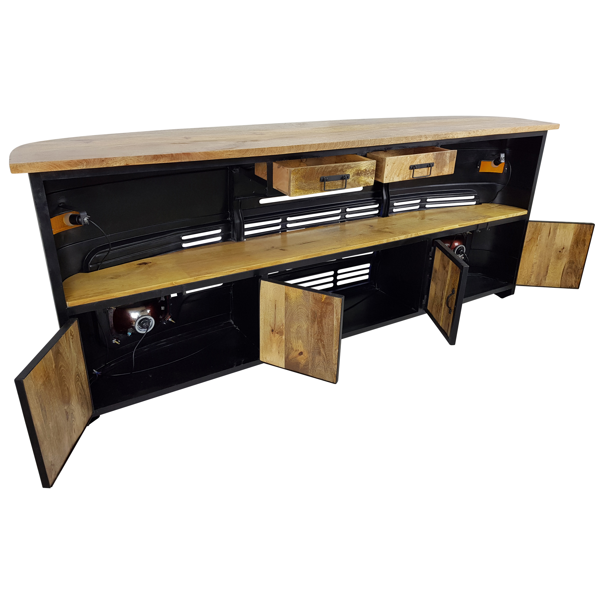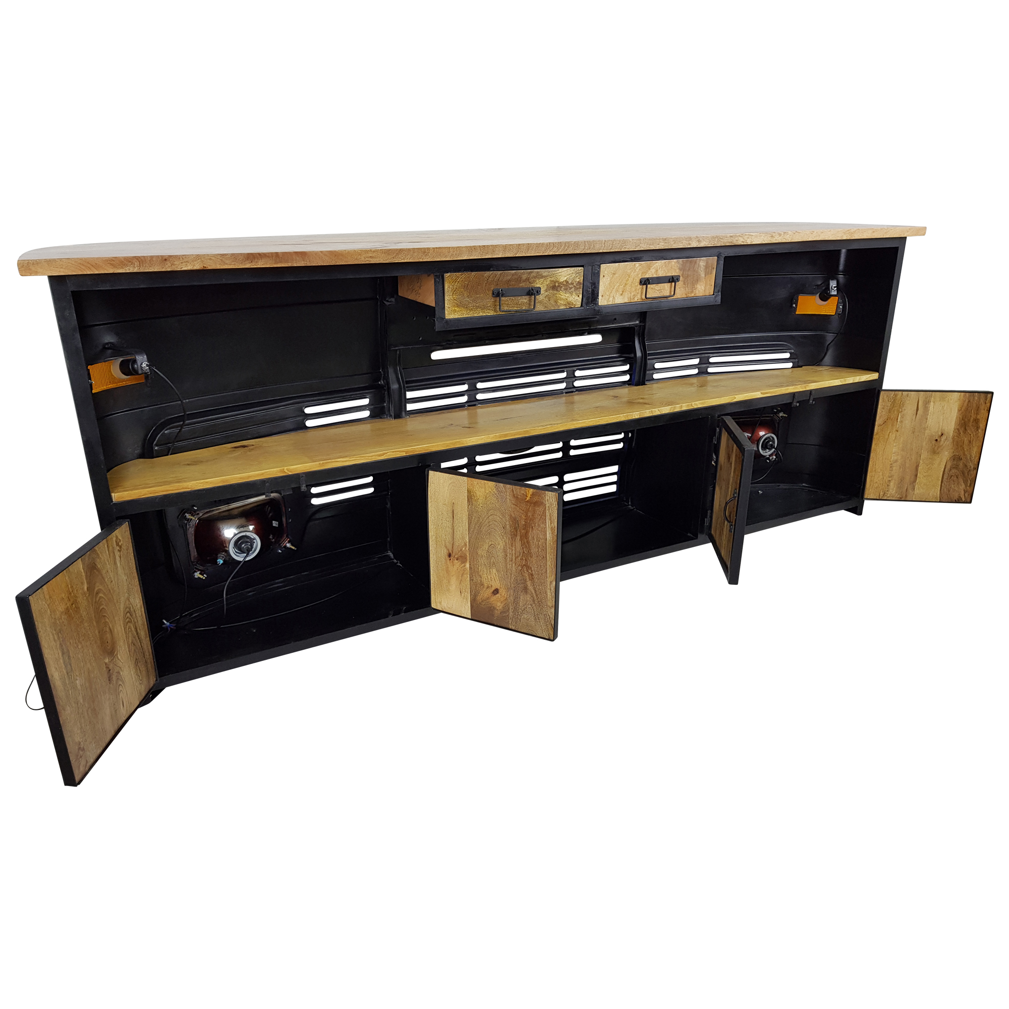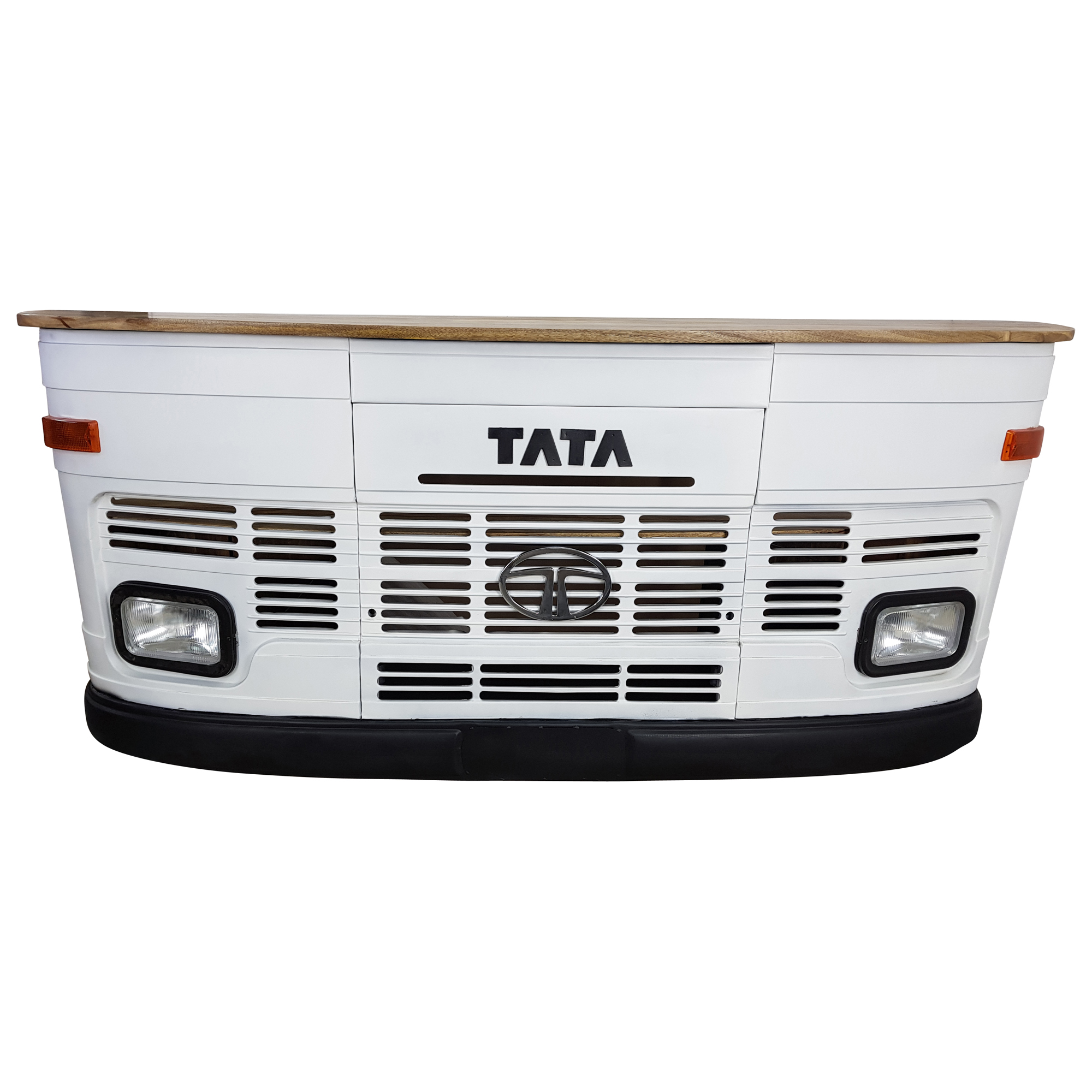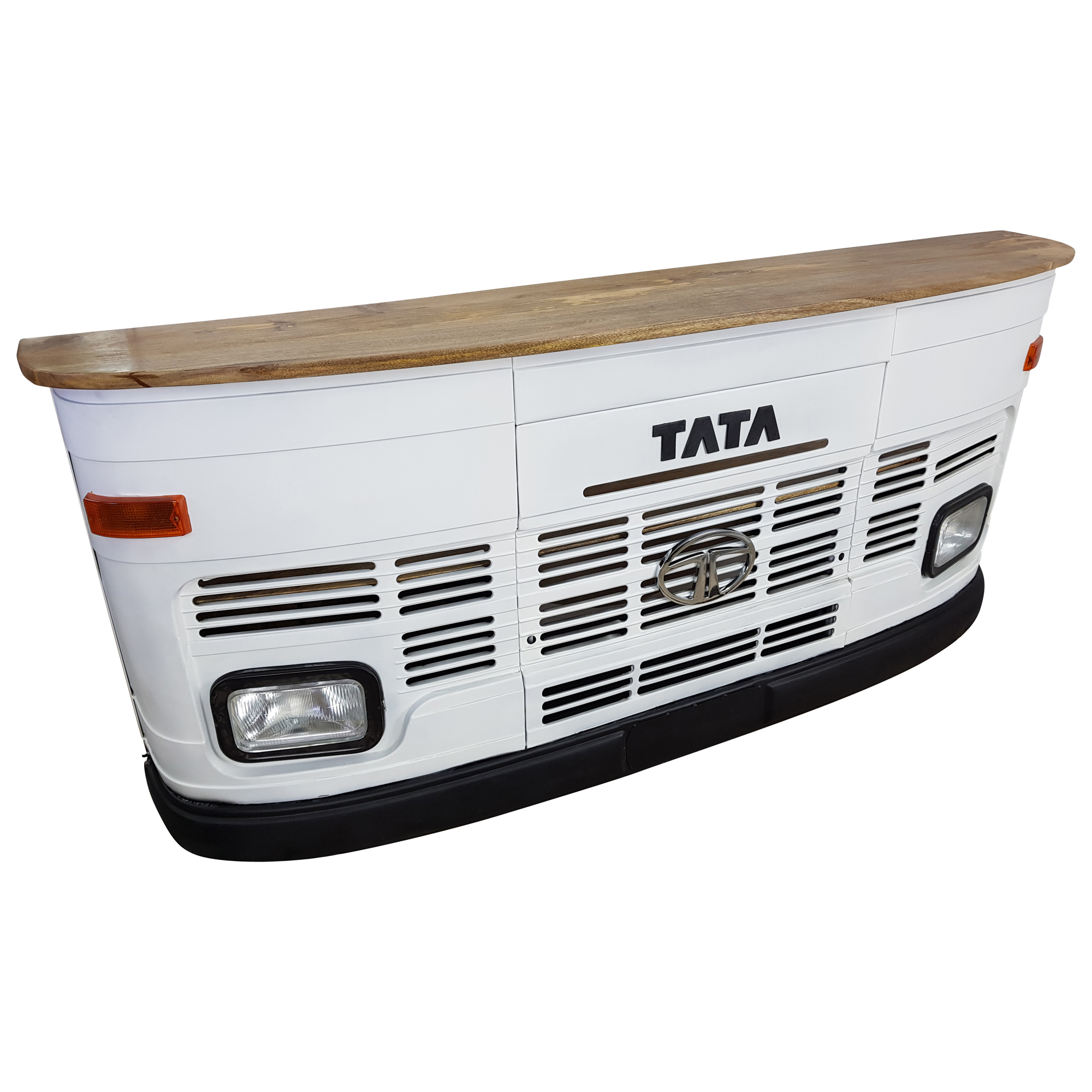 Jede LKW Theke ist einzigartig und wird in Handarbeit aus robusten Massivholzmöbeln sowie echten, alten Autoteilen hergestellt. In diesem Fall handelt es sich um die Front eines Tata LKWs, der ursprünglich aus der Produktion des größten und ältesten indischen Automobilherstellers Tata Motors stammt. Der originelle Eyecatcher ist also nicht nur ein Auto Möbelstück mit repräsentativem Flair, sondern hat auch eine eigene Geschichte. Kleine „Makel“ werden deshalb bewusst nicht kaschiert, denn genau diese verleihen dem Tresen seine Individualität und Besonderheit. Mit einer Größe von ca. 245cm Breite, 43cm Tiefe und 107cm Höhe ist die stilvolle Empfangstheke im Retro Vintage Design sowohl für große als auch für kleine Räume geeignet. Die Leuchtmittelfassung ist auf handelsübliche E27 LED-Leuchten ausgerichtet.