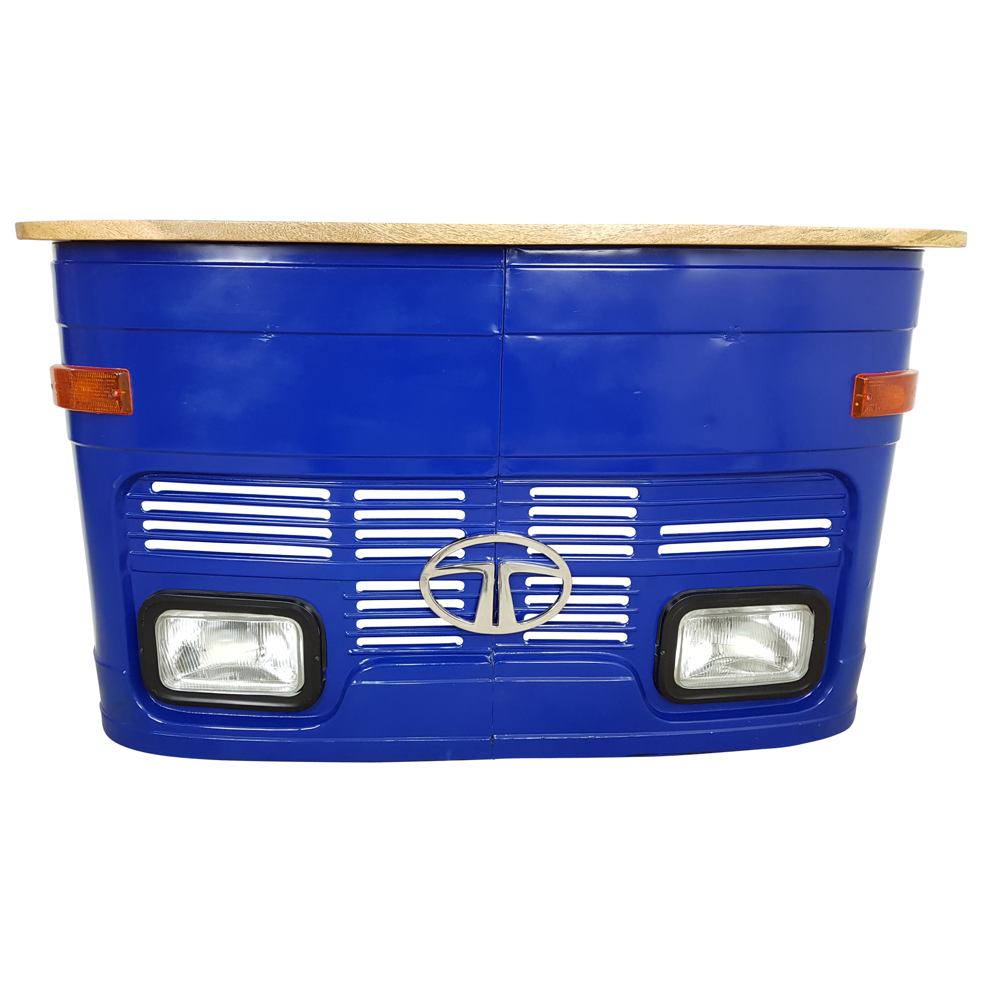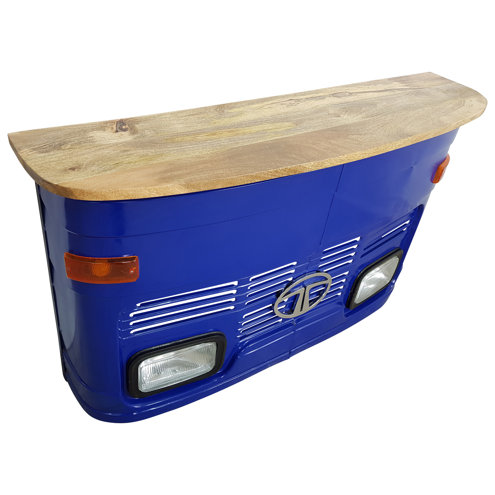 1 x Original Tata als Theke klein in blau, beleuchtet, Mango Holz . Gefertigt werden diese Theken aus einer Kombination von echten Frontteilen alter Fahrzeuge in Kombination mit hochwertigem und robustem Massivholz. Die Produktion wird in Handarbeit durchgeführt, was im gleichen Zug bedeutet, dass es sich bei jeder Theke um ein echtes Unikat handelt. Maße ca. (Breite / Tiefe / Höhe ): 159 / 41 / 92 cm